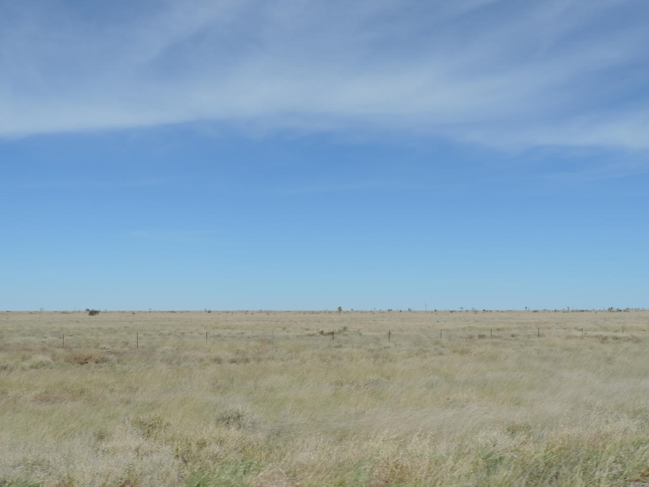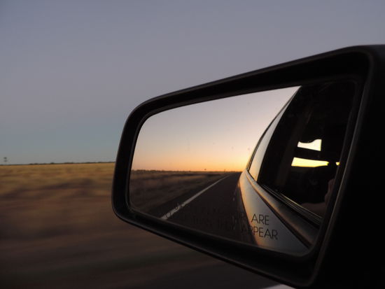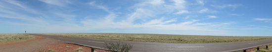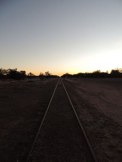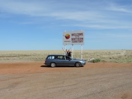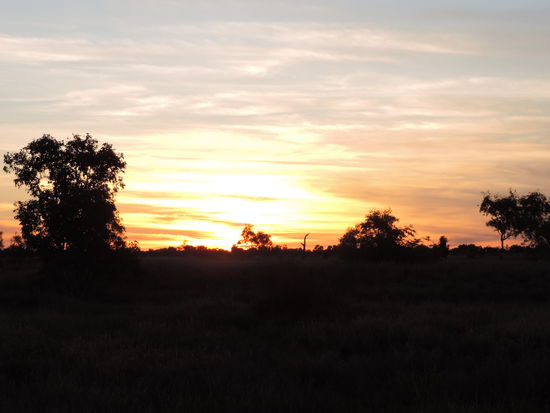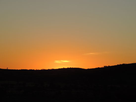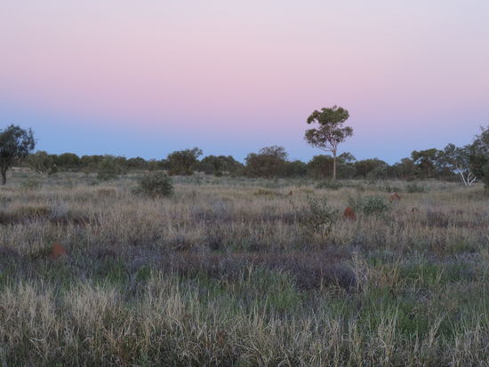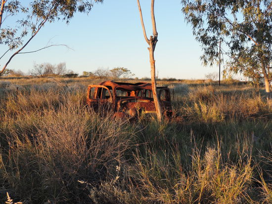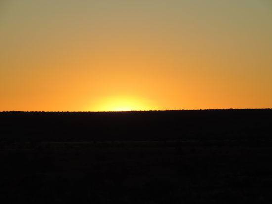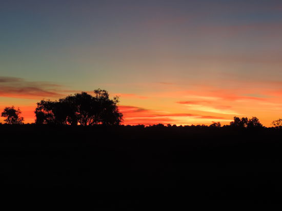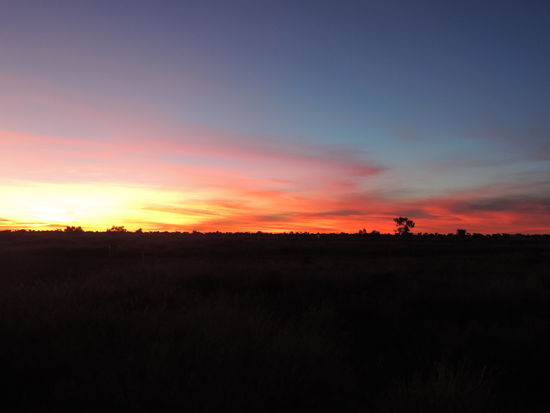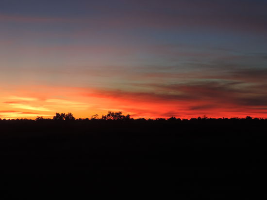 Am nächsten Morgen machten wir uns nach einem Kaffee auf den Weg Richtung Camooweal. Dort tanken wir auf, gingen heimlich duschen und frühstückten. Dann überquerten wir die Grenze zum Northern Territory, unserem 5. von insgesamt 6 Staaten, die wir durchqueren. Von nun an wurden die Entfernungen noch größer, die toten Kängurus am Straßenrand weniger und die Ausblicke unendlich weit und wunderschön, wenn man die vereinzelt toten Kühe am Straßenrand übersah Wir konnten den Horizont nur erahnen, nach vorne und durch den Rückspiegel sahen wir das gleiche Bild: unendlich lange Strassen, kein Ende in Sicht und flackernder Horizont. Links und rechts des Highways sah man immer wieder die rote Erde aufleuchten, die von ein paar Büschen und Sträuchern bedeckt war und immer dunkler wurde. Ich hatte es ja schon oft genug auf Bildern gehen, aber es dann live zu sehen war schon der Wahnsinn. Kurz vor Sonnenuntergang hielten wir kurz hinter dem Dörfchen Tableland, das nur aus einem Roadhouse besteht, auf einem Campground, wo wir mit ganz herzlichen Australiern ins Gespräch kamen, am Feuer saßen und einen atemberaubend schönen Sonnenuntergang genossen!