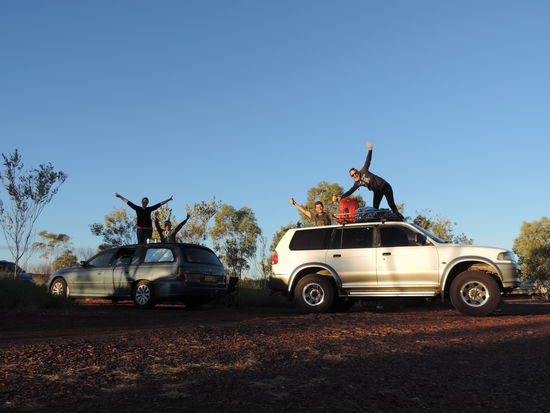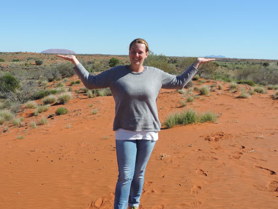 Am nächsten Morgen schauten wir uns das Spektakel auch noch bei beim Sonnenaufgang an. Es war schweinekalt und der heiße Kaffee brachte da garnichts! Erst die Heizung im Auto taute unsere gefrorenen Zehen wieder auf. Unsere Wege trennten sich bis zum Nachmittag, da Oli und ich etwas früher in Alice Springs sein wollten, um noch zu waschen. Wir erledigten den Wäscheberg und trafen Sarah und Thomas am Supermarkt wieder, wo die Lebensmittel aufgefüllt wurden, vollgetankt und raus aus der Stadt, denn wohl fühlten wir uns auch hier nicht, obwohl die Stadt sehr überschaubar und auch recht schön ist, aber hier liefen wieder viele Betrunkene herum. Wir fuhren zu dem nächstgelegenen Campground, 50km außerhalb der Stadt. Auch diese Nacht wurde richtig eisig. Wir hatten bestimmt an die 0 Grad Celsius und ich habe mächtig gefroren. Am Dienstag, den 28.6.16, nach 8 Tagen on the Road kamen wir mit Versace, und Sarah und Thomas mit Hermann, in Yulara an. Zwischenzeitlich hatten wir schon ein paar Mal die Luft angehalten. Erst kamen wir am Mount Connor vorbei, auch ein riesiger Berg, der manchen Reisenden wahrscheinlich schon getäuscht hat. Aber er ist viel kantiger als der Uluru. Außerdem sagten die Kilometerpfeiler am Highway noch 140km bis zum eigentlichen Ziel voraus. Dann aber kam er wirklich! Plötzlich tauchte aus dem Nichts dieser riesige Berg auf! Unfassbar und wirklich atemberaubend! Da war sogar Oli platt, der ja eigentlich garnicht herfallen wollte. ("Wegen diesem roten Berg..."☺) Wir bekamen einen günstigen Platz auf dem Campingplatz und buchten uns dort für 3 Tage ein.
