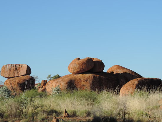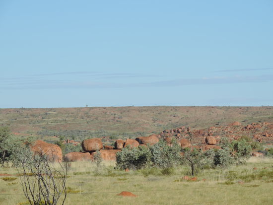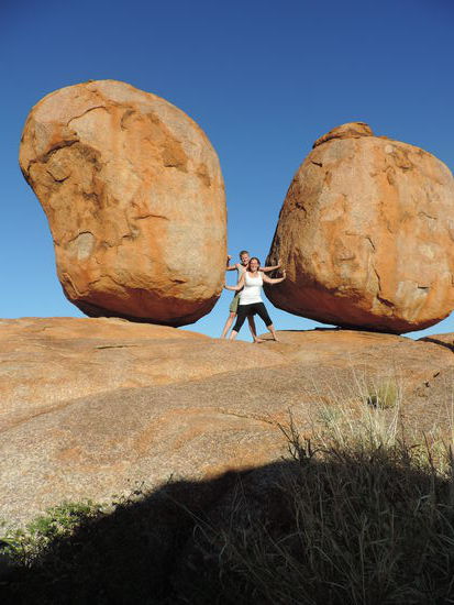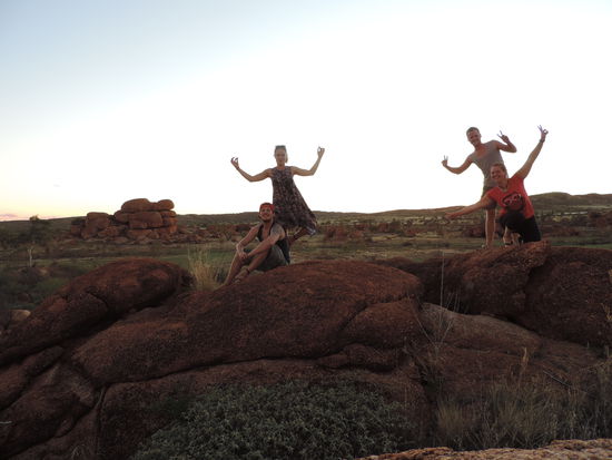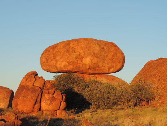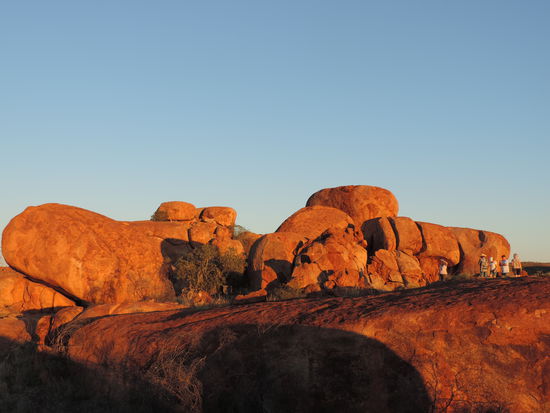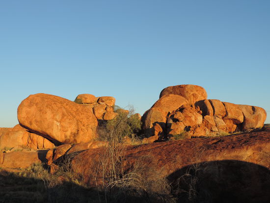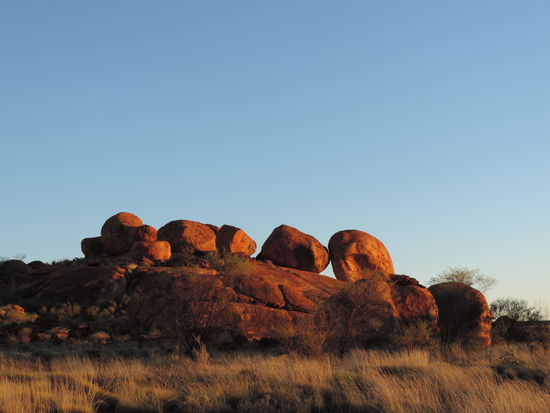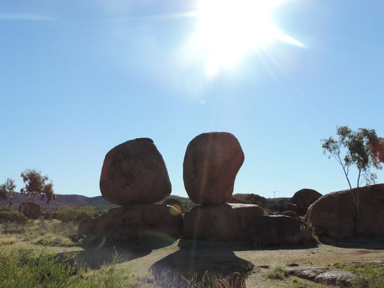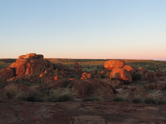 Nachdem der Kühlschrank gefüllt war, machten wir uns wieder auf den Weg Richtung Devils Marbles, Karlu Karlu in der Sprache der Aborigines, einer Gesteinsformation bestehend aus riesigen Kugeln, die die Eier der Regenbogenschlange sein sollen, einem wichtigen Wesen der Traumzeit, der Religion der Aborigines. Hier verbrachten wir den Sonnenuntergang zwischen den Felsen und sahen dabei zu wie die Kugeln im Sonnenlicht ihre Farben änderten.