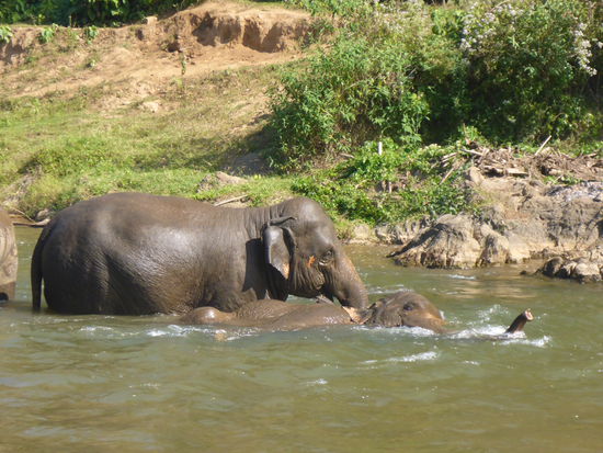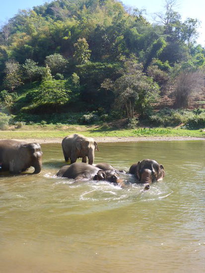 Nach dem Mittagessen durften wir den Elefanten beim Baden zuschauen, haben die drei männlichen Elefantenbullen gesehen und durften mit einer anderen Elfantenherde zum Fluss um sie dort mit Wasser abzukühlen.