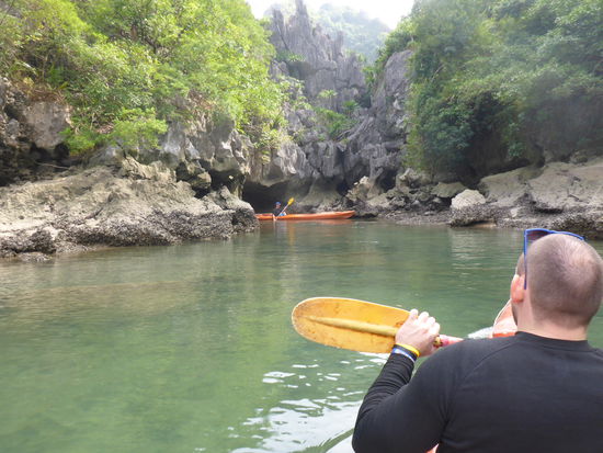 Von Monkey Island fuhren wir durch die Halong Bucht und kamen an einem schwimmenden ,,Hausschiff" an. Dort bekamen wir ein Kanu und konnten durch die Buchten fahren.