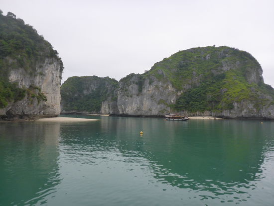 Nach dem Kajakfahren gab es auf dem Boot Mittagessen, hierbei hatte man die Wahl zwischen Reis, Frühlingsrollen mit Fleisch, Fisch, Seafood und Gemüse. Für die Vegetarier wurde Tofu angeboten. Als alle satt waren tuckerte das Boot langsam los und steuerte eine Bucht zum Schwimmen und Schnorcheln an. Da die Sonne uns an diesem Tag etwas im Stich lies, war es bei ca. 23 Grad Außentemperatur recht kalt. Aber trotzdem wollte ich einmal reinspringen und im nachhinein war das Wasser doch recht warm.