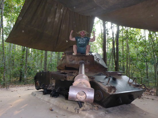 Am Nachmittag ging es dann mit den Chu Chi Tunnel weiter, diese liegen ca. 60 km auserhalb von HCMC. Nach 90 Minuten Busfahrt haben wir das Tunnelsystem erreicht. Toni unser Tour Guide ist ein Kriegsveteran und erzählte uns über die Vorgehensweise in den Tunneln. Gegen 19:30 waren wir dann wieder in Saigon.