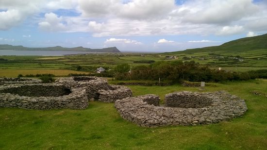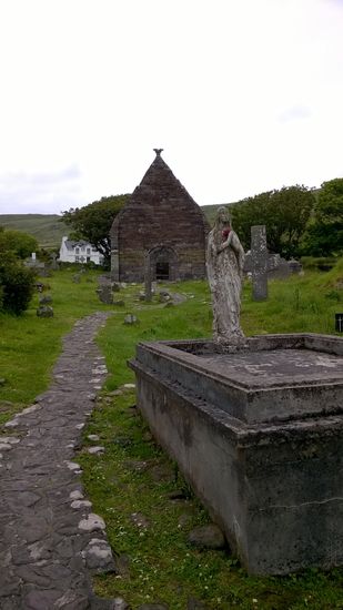 Gut erholt und gestärkt starten wir heute nach Dingle. Wieder erwartet uns viel Grün und der Atlantik und endlich sehen wir auch mal Kühe und Schafe Wir unternehmen eine kleine Wanderung vom Gallarus Oratory zur Kilmalkedar Kirche. Die Route ist sehr schön, ruhig und ländlich-idyllisch, nach allem was wir schon gesehen haben aber nur mäßig spektakulär Schöne Aussicht und ein kleiner keltischer Friedhof mit Kirchenmauern aus dem 12. Jahrhundert - immerhin typisch irisches Feeling