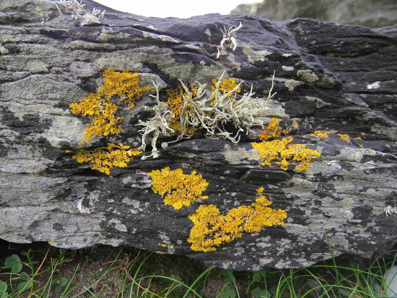 Schwarzer, grauer, grünlicher Schiefer, geblockt, geschichtet, zerbröckelt, unten die Gischt von Norden her. Dazwischen Pflänzchen, Moos, Flechten, farbige kleinste Pilze über den Steinen. Faszinierend. Allzu nahe an die Klippen wagen wir uns nicht.