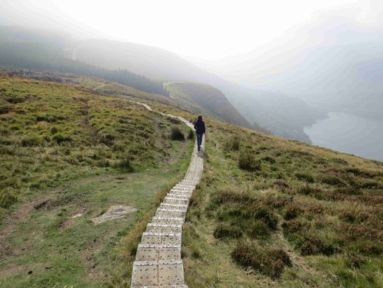 Auf dem Rückweg steigt der Nebel dann plötzlich wieder hoch, unsere Holzbohlen weisen uns jedoch unproblematisch den Weg, der Lough Tay verschwindet, taucht dann wieder auf und wir finden ohnen Probleme unser Auto wieder.