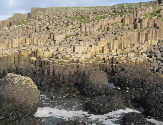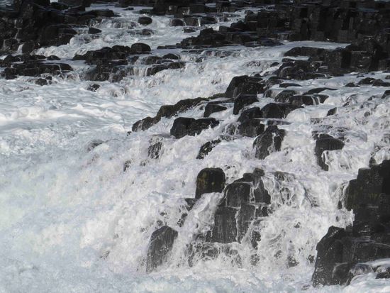 Dann nähern wir uns den „Giants Causeways“. Zuerst der Schock, ein Eingangsgebäude wie ein Flughafenterminal, 18 Pfund (26 €) Eintritt, Multivision, Audio Guide, Parken, Café aber immerhin kostenlose Toiletten. Dann trotz Nachsaison viele Besucher. Dann stehen wir vor den vieleckigen (um nicht polygonal zu sagen) Blöcken, die ins Meer zu gleiten scheinen, schwarz, beige. Zuerst muss man sich daran gewöhnen, dass die Giant Causeways von roten, blauen Regenjacken begangen werden, dann sind wir selbst drauf, gehen vorsichtig über diese Jahrmillionen alten kantigen Basaltblöcke, sehen die Gischt, die über die Steine tost. Trotz der vielen Leute (zu denen wir ja auch gehören) ein faszinierender Anblick. Man muss sich einfach irgenwo hinsetzen und alles auf sich wirken lassen und an den Riesen denken, der diesen Steindamm Richtung Schottland gebaut hat, der Liebe wegen...