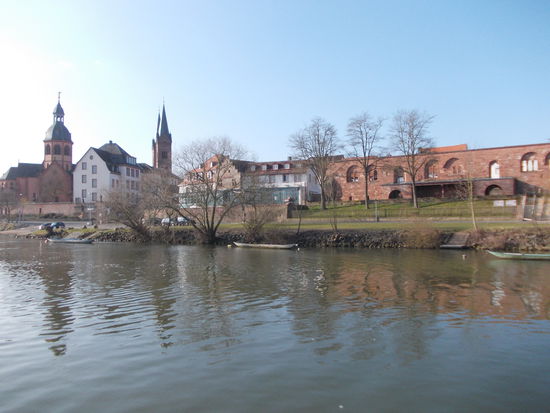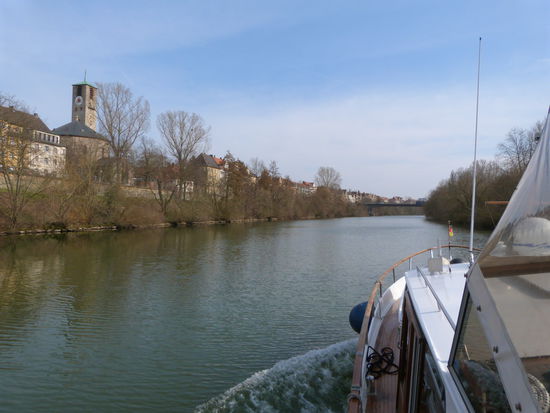 Da morgens die Sonne tieforange auf uns runterlacht, erwarten wir wieder einen strahlenden Tag, an diesem Freitag, dem 13. März, wenn wir auch an Deck Schlittschuhe laufen könnten.  Im Laufe des Tages bewölkt sich der Himmel, es wird kälter, die Windsbraut aus dem Osten weht uns bis auf die Knochen.  Es ist bereits dunkel als wir im Yachthafen Stadtprozelten den Anker  fallen lassen, da  auch hier kein Steiger im Wasser ist.  Das erweist sich leider als fatal. Im Schlick des Untergrunds hält der Anker nicht gut. Der Sog der Berufsschifffahrt reißt uns in dem kleinen Loch hin und her.  Als wir mit dem Heck gegen einen Dalben donnern, fesselt Manfred Beluga daran und bringt vorne ein Tau um eine Baumwurzel. Alles sehr mühsam. Wir hoffen, dass um 22 Uhr Schluss mit lustig ist, da dann die Schleusen schließen, doch um halb zwei knallen wir wieder gegen den Dalben. Anscheinend gab es eine Sonderfahrt.  Gut abgefendert ist es nur ein akustisches Problem.  Aber Schlaf können wir uns erst mal abschminken. Eine halbe Stunde bevor um 6 morgens die Schleusen wieder ihren Betrieb aufnehmen, stehen wir auf. Um sieben können wir dann mit einem Berufsschiff schleusen.  Nun ja, wir sind ja nicht auf einer Vergnügungsreise.