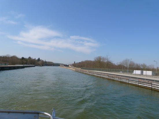 Und sonnig geht’s es auch den nächsten Tag weiter. Endlich mal ein Tag ohne Schnattern und ohne eiskalte Füße. Vormittags kommen wir immer recht flott voran, mittags laufen wir regelmäßig einem Großschiff von 110 oder 130 m auf und dann geht nix mehr. Im Oberwasser schaffen sie ja noch ca. 8 Stundenkilometer, wenn’s auf  die nächste Schleuse zugeht, schaffen sie gerade noch 5 bis 6 km/h.  Mühsam, mühsam. Und dann brauchen die Schiffsführer natürlich entsprechend lang bis sie die Riesenpötte in die Schleusen rein- und wieder rausrangiert haben.  Um unser Glück zu vollenden,  holen wir auch noch ein holländisches Sportboot mit zwei  älteren Herren an Bord ein.  Sie hängen ihr Boot vorne und hinten an. Das bringt sie jedes Mal in Probleme. Klammert der Vordermann sich an den Poller, steht das Boot regelmäßig quer in der Schleuse und scheuert mit dem  Bug an der Schleusenwand.  Wir versuchen es mit guten Ratschlägen und nach einigen Schleusen versuchen sie es dann so zu machen  wie wir und siehe da… es funktioniert.