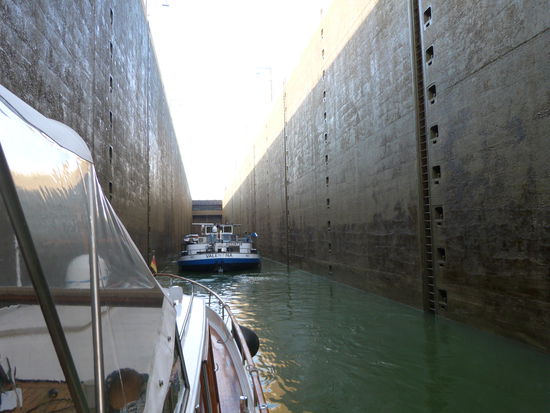 Mein Skipper ist kaum noch zu bremsen. Kurz nach sechs wirft er bereits die Leinen los.  Tatsächlich können wir schon um sieben mit dem rumänischen Frachtschiff „Valentina“ die Schleuse Hausen nehmen.  Wir datteln weiter hinter ihm her. Das wird ein langer Tag. Zwei 18 m hohe Sparschleusen  ohne Schwimmpoller stehen uns noch ins Haus.  Die machen mir ein flaues Gefühl in der Magengegend.  Wir haben in unserem Skipperleben einige tausend Schleusen gemeistert, wahrscheinlich mehr, als mancher Schiffsführer in seinem ganzen Berufsleben, trotzdem  hab ich vor diesen Wahnsinnsdingern einen Heidenrespekt.