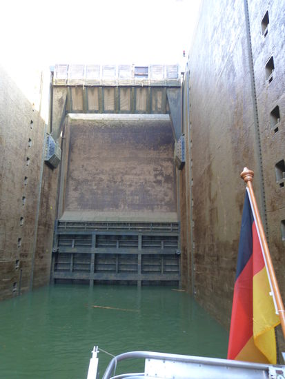 Ein Lichtblick:  das war die letzte 18 m Schleuse, die wir krabbeln müssen.  Noch eine mit gut 9 m, dann kommen endlich die Schwimmpoller.  20 km Stauhaltung liegen vor uns und wir dürfen mit 8 km/h hinter  dem Frachter herzockeln.