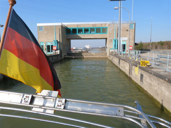 Als Manfred die Schleuse Bamberg ruft und ein Sportboot für die Bergschleusung anmeldet, sagt der Schleusenmeister völlig entrüstet: „ Es… ist… März!“ Dass er nicht laut sagt: „Was wollt Ihr Irren denn jetzt schon hier?“ ist alles. Gedacht hat er es bestimmt. „Na ja, wenn man hagebuchen genug ist….“, dann öffnet er die Schleuse für uns.