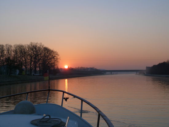 Als morgens um halb sechs der Wecker piepst, hat sich die „Valentina“ schon längt weggeschlichen. Auf Schiff und Ufer ist schon wieder eine dicke Reifschicht. Wir frühstücken und legen um sechs ab. Wir haben eineinhalb Stunden Fahrzeit über die Scheitelhaltung des Main-Donau-Kanals vor uns. Dann geht’s nur noch abwärts mit uns. Leichter Dunst wabert auf dem Wasser und die Sonne zaubert mit einem Feuerball ein herrliches Aquarell aufs Firmament. Diese Sonnenaufgänge an Bord werde ich sicher vermissen.