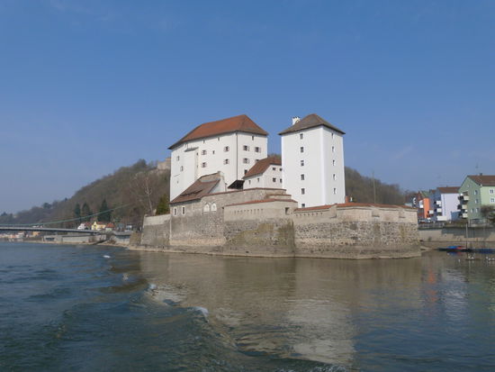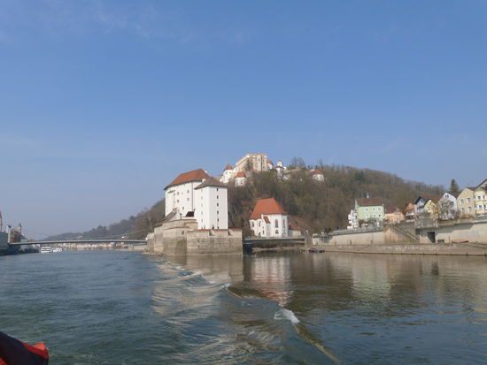 Es kommen uns viele Frachter entgegen, auch ein Arosa-Schiff und das erste Muflon. Muflons sind riesige Schubschiffe, die ich bis jetzt nur hier an der Donau gesehen habe. Je weiter man Richtung Ukraine kommt, desto riesenhafter werden sie. Oftmals sind sie dann mit 12 Leichtern unterwegs. Schleuse Kachlet lässt uns alleine in die Kammer. Und schon sind wir in Passau. Wer diese Stadt nicht kennt, hat was verpennt. Wunderschöne Innenstadt, herrliche Kirchen, die Festung auf der gegenüberliegenden Uferseite, das ganze Panorama mit der weißen Flotte am Kai, einmalig. Aber was uns zum Klatschen bringt, ist der Stadt-Fuchs. So nennt sich hier der Stadtführer. Dieser Mann ist einfach genial. Ob als Nachtwächter verkleidet, oder in den Kostümen der Epochen von denen er erzählt, als Ritter, Edelmann, Graf oder Fürst. Man kann ihn mieten, wenn man z.B. eine Gesellschaft auf der Festung oder in einer Burg oder einem Schloss in der Umgebung hat. Dann erzählt er anschaulich von der Geschichte und bezieht auch das Publikum mit ein. Ruckzuck wird man da zum Kaiser, Knappen oder Henker. Ich könnte ihm stundenlang zuhören.