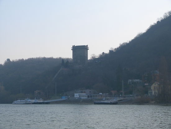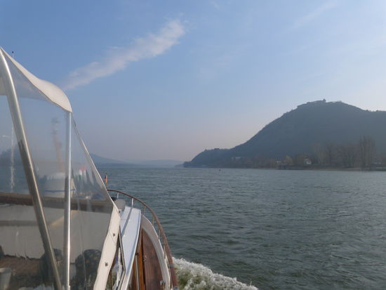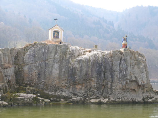 Jochenstein ziert sich ein bisschen, er weiß nicht, wann das mit uns weitergeht. Was solls, ich haue meine Bratkartoffeln in die Pfanne. Als wir uns gerade an den Tisch setzen zum Essen, kommt der Ruf über Lautsprecher, er schleust uns alleine. Den Jochenstein mit seinem Kapellchen und – ich nehme an, dass er es ist, dem Nepomuk darauf fotografiere ich von allen Seiten. Am Grunde des Felsen hat Isa, die Schwester der Loreley, ihr Nixenschloss und warnt die Schiffer bei Nebel. Leider glänzt sie durch Abwesenheit. Schade.