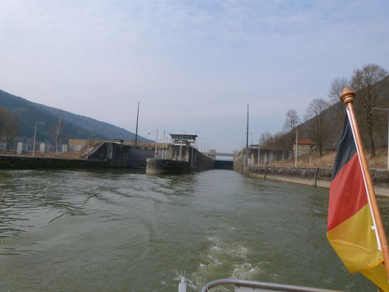 Wir warten auf ein deutsches Frachtschiff und dann geht’s abwärts wie die Feuerwehr. Unten warten bereits ein Koppelverband, zwei Frachtschiffe und… natürlich ein Hotelschiff. Ich gebe es zu, wir sind ein bisschen gehässig und gönnen dem Kreuzfahrer, dass er als allerletzter in die Schleuse darf, obwohl er bretzelbreit vor der Ausfahrt liegt. Es gibt halt doch noch eine Gerechtigkeit.
