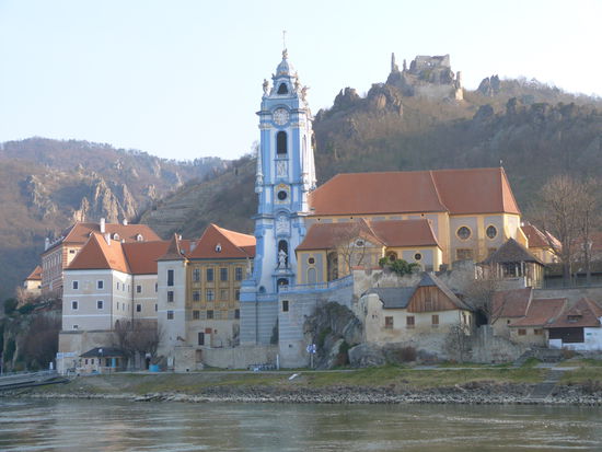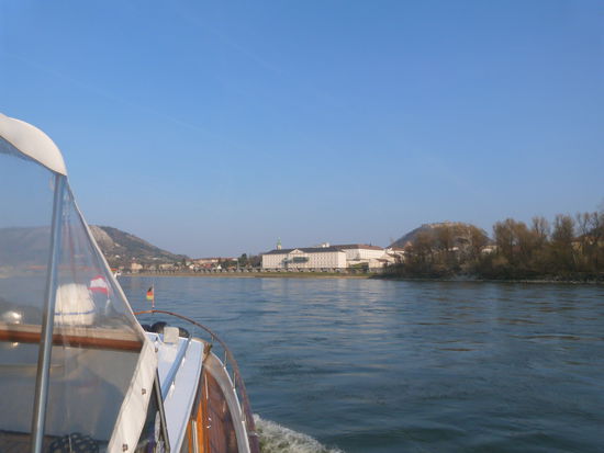 Es ist nicht nur die senile Bettflucht, die Manfred ziemlich früh aus der Koje kriechen lässt. Als ein Feuerball neben Stift Melk hochsteigt, werfen wir die Leinen los. 58 km liegen zwischen der Schleuse Melk und der nächsten, Altenwörth. Unreguliert ist die Donau hier ganz flott unterwegs und auch wir bekommen ein wenig Schub. Wunderschön das Tal der Wachau, zauberhaft die Schlösser, Burgen und die kleinen Orte, die sich ans Ufer schmiegen. Schönbühel, majestätisch auf einem Feld, davor Felsen im Wasser, ähnlich der Pfalz bei Kaub am Rhein. Die Teufelsmauer am linken Ufer, St. Michael am rechten Ufer, ein Felsrutsch, ganz frisch, der einem einen Schauer über den Rücken jagt, dann Dürnstein mit der blauen Kirche, ein Traum und außerdem das bekannteste Weinbaugebiet der Wachau. Prompt liegt auch ein Hotelschiff davor. Stift Göttweig, Krems, die Sehenswürdigkeiten reihen sich wie Perlen an einer Schnur am Ufer entlang.
