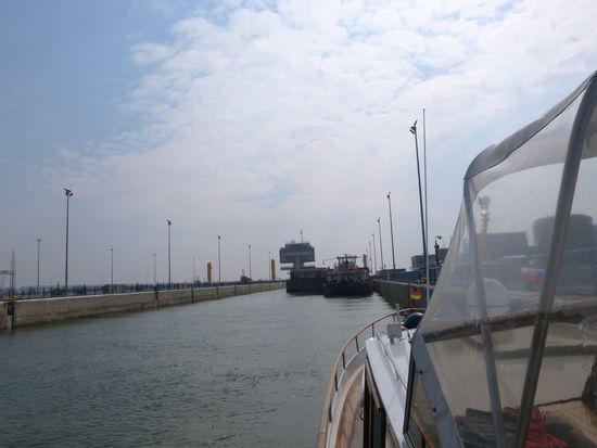 Wir sollen so lange an die rechte Mauer liegen. Kaum sind wir fest, kommen zwei Herren um unsere Papiere zu kontrollieren. Sie habens sehr wichtig. Zulassung, Schiffsbrief, Führerschein, Versicherung. Und dann werden wir nachdrücklich aufgeklärt, dass wir uns viel zu spät angemeldet hätten. Bei km 18 hätten wir die Schleuse schon rufen müssen. Es könnten ja gefährliche Wellen entstanden sein, dann hätten wir nicht fahren dürfen, bla,bla bla…. Als wären wir blind. Wir müssen hoch und heilig versprechen, dass wir uns beim nächsten Mal unbedingt bei km 18 melden müssen. Allerdings steht weder was im Donau-Handbuch, noch in den Karten von Verbergh, noch gibt es eine Hinweis-Tafel an Land. Anscheinend müssen die Skipper und Schiffsführer hier auch Hellseher sein.