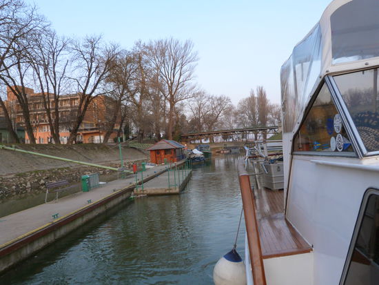 25 km später erreichen wir Bezdan. Unser Einklarierungsort in Serbien. Es versteht sich von selbst, dass an dem alten Steiger ein Frachter hängt. Auf der Innenseite des Pontons liegt das Versetzboot Erika. Und neben der Barkasse sind vielleicht noch 10 m Platz bis zum Ufer. Die Haare stellen sich mir im Genick, als Manfred nach dem Echolot verlangt und Beluga neben die Erika rangiert. Erstaunlicherweise hat es aber Wasser genug. Ich marschiere zum Hafenamt, auf alle Unbilden gefasst. Immer noch knicken die einzelnen Stufen der Treppe nach hinten weg. Da hat sich gar nix verändert. Doch in dem Gebäude hat sich viel getan. Alles ist frisch gestrichen. Jeder einzelne Raum in einer anderen Farbe. Und was für Farben. Giftgrün, grellorange, aufdringlich pink, mir flimmert vor Augen. Der Hafenkapitän ist ein sehr netter, ruhiger Vertreter, mit ganz vielen Streifen am Sakko. Er spricht ein bisschen englisch. Dann kommt ein junger Mann, stellt sich als Agent vor, kassiert 70 Euro und verschwindet. Derweil muss der Chef neue Crewlisten tippen und andere Listen ausfüllen. Insgesamt 16 Blätter druckt er aus. Jeder Satz, auch den, den ich erhalte, hat 4 Blätter, hochoffiziell abgestempelt und von ihm und mir unterschrieben. Im Einfingersuchsystem dauert das zwar ein bisschen, aber trotzdem dauert Einklarieren in Serbien heute nicht so lange, wie raus aus der EU. Und als hätten wir uns das redlich verdient, lacht die Sonne und es ist frühlingshaft warm. Er hätte mal zwei Monate in Deutschland gearbeitet, erzählt mir der Chef, da wäre er fast erfroren. Dann begleitet er mich ans Boot und verabschiedet sich mit dem Wunsch, dass wir im nächsten Jahr wieder kommen.