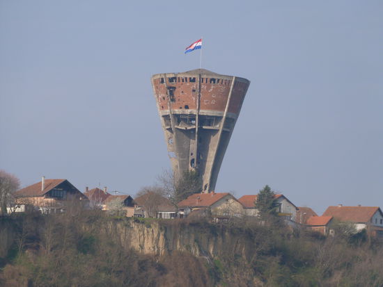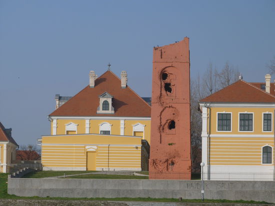 Auf kroatischer Seite das kleine Dorf Dalj, heute sind alle Serben fortgezogen. Manchmal noch ein zerbombtes Haus. Dann Vukovar. Es hat eine gewisse traurige Berühmtheit durch den Balkankrieg erlangt. Heute erstrahlt die Stadt wieder neu. Eine alte Fabrik zeigt noch die Kriegsschäden, doch daneben ist sie nagelneu wieder aufgebaut. Ein zerschossener Turm, damit man auch wirklich nicht vergisst, ein Wasserturm mit Einschusslöchern. Wieder auferstanden aus Ruinen… oder so ähnlich. Vukovar war einst im Besitz der Grafen von Eltz, sie haben ihren Stammsitz in Eltville am Rhein und Burg Eltz in der Eifel gehört ihnen auch.