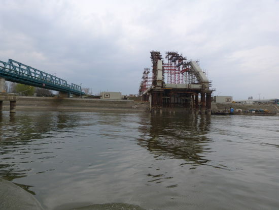 Vor uns liegen der Gabcikovo-Kanal und die Schleuse mit ihren gigantischen Ausmaßen. 275x34x20 m Hub. Die Donau plätschert unsichtbar neben uns her, denn der Kanal ähnelt hier einem See. Gefährliche Wellen bilden sich bei Sturm, selbst bei dem derzeit strammen Ostwind, der von einem Sturm noch weit entfernt ist, springen uns 1 m hohe Wellen entgegen. Beluga schneidet sie wie Butter. An der Schleuse werden wir Aufenthalt haben, entnehmen wir dem Funk. Es werden Taucherarbeiten durchgeführt. Und tatsächlich, mit 2 Stunden sollen wir rechnen, erklärt uns der Schleusenchef. In sehr guten Deutsch übrigens.