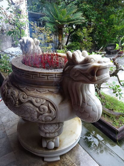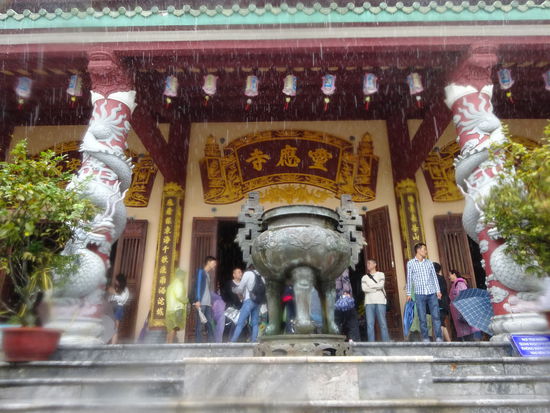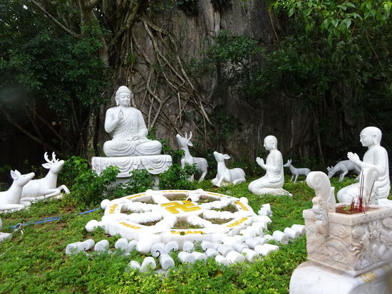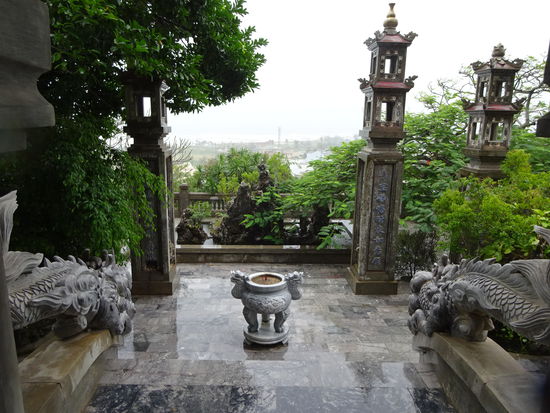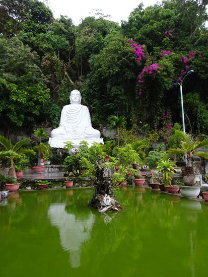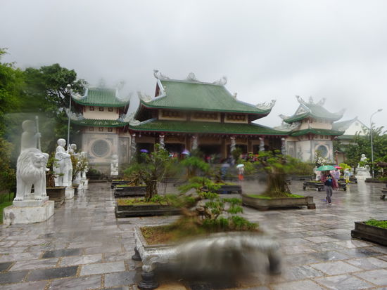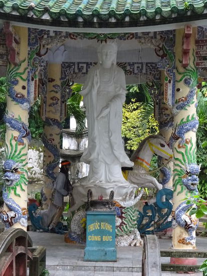 Wie auch schon gestern in der Altstadt von Hoi An so regnete es auch heute zum Teil sehr stark bei meinem Ausflug in die Marmorberge. Die 5 Kalksteinfelsen nördlich von Hoi An erhielten Ihren Namen auf Grund der sehr reichen Marmorvorkommen in den Felsen von Kaiser Minh Mang im Jahre 1825 . Im Umfeld der Berge gibt viele Steinmetzarbeiter die Ihre Schnitzereien und Souveniers zum Verkauf anbieten. Viele der Grotten in den Bergen werden seit Jahrhunderten als Andachtsräume genutzt. Für diesen Tagesausflug zu den Marmor & den Affenbergen am Nachmittag inkls. Mittagessen buchte ich gestern in dem Reisebüro wo ich auch mein Busticket nach Nha Tran kaufte einen Fahrer für 440000 VND = 18,45 Euro.