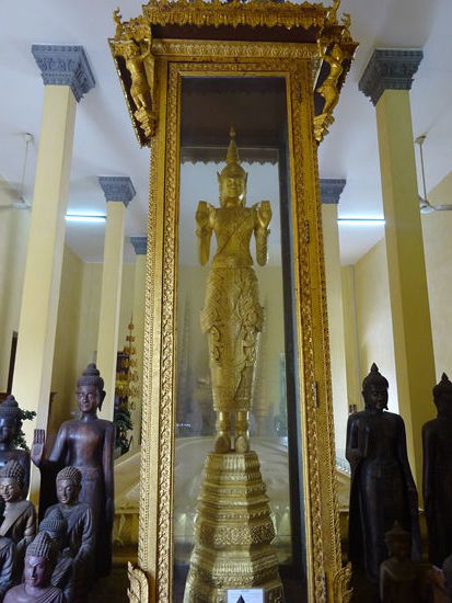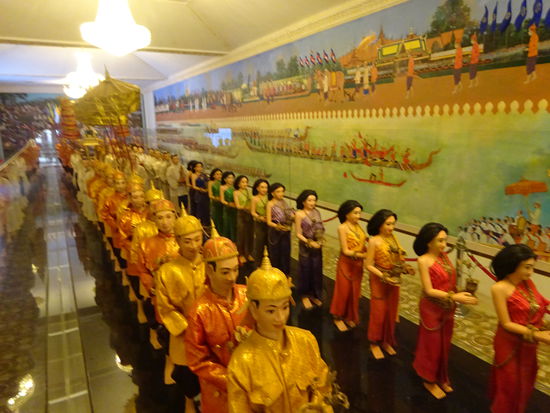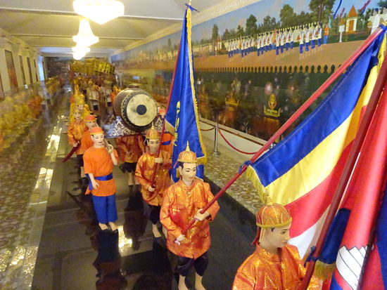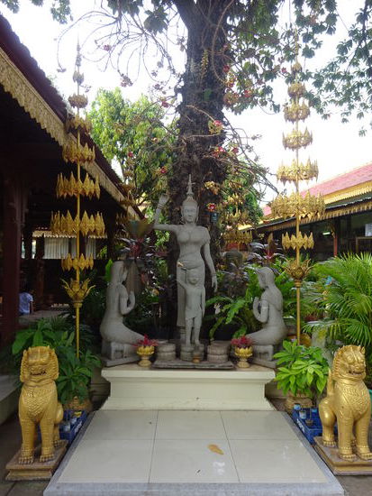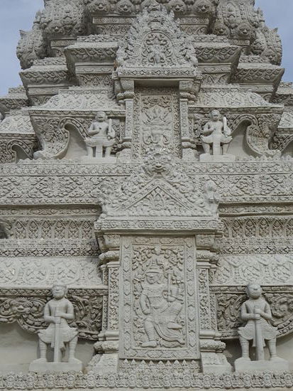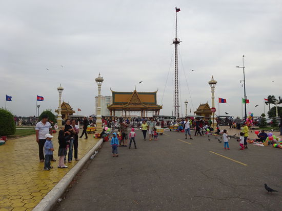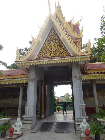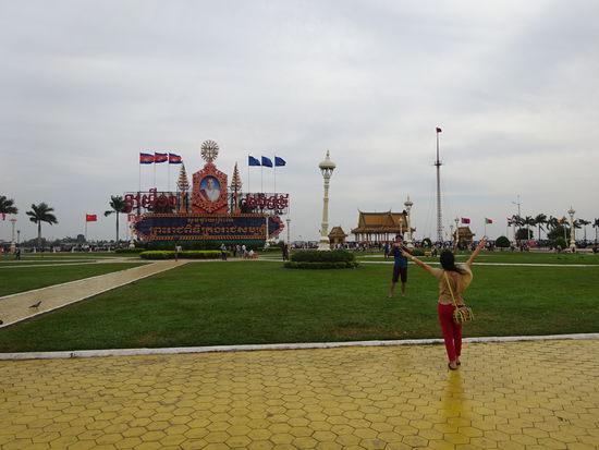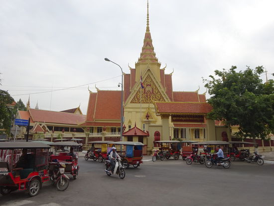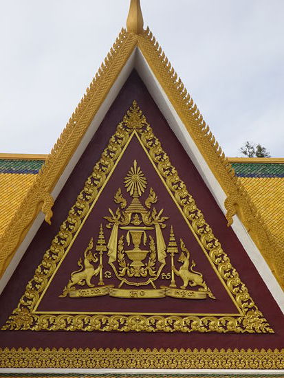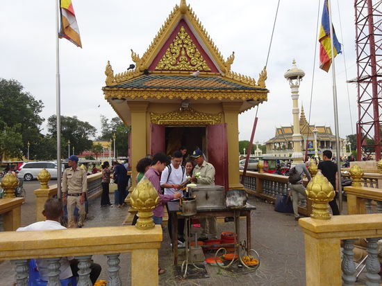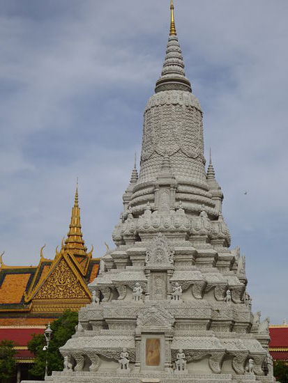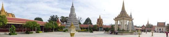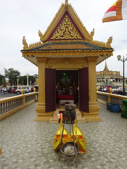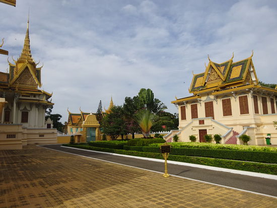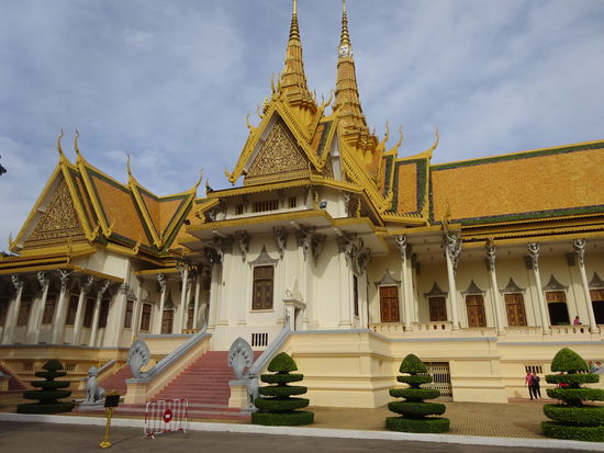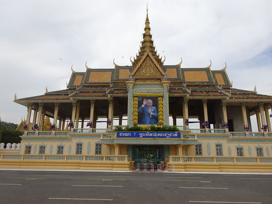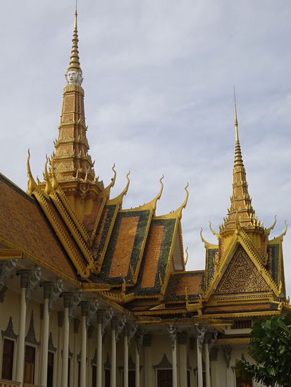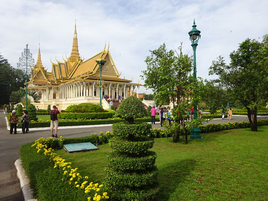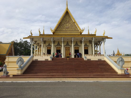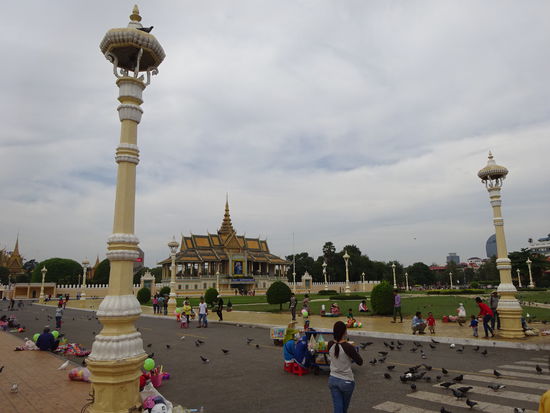 Der Königspalast in Phnom Penh ist wie der Name schon sagt Sitz des Königs von Kambodscha . Er ist im traditionellen Khmer Stil erbaut worden und die gelb und weiß gestrichenen der umgebenen Mauer repräsentieren den buddhistischen und hinduistischen Glauben . Der heutige Palast ist Anfang des 20. Jh. an der Stelle errichtet worden wo einst der Palast von König Ponhea Yat aus dem Jahr 1434 stand von dem aber heute nichts mehr übrig ist. Der heutige Palast ist ein beliebter Treffpunkt und Fotomotiv nicht nur für die Touristen sondern auch für Familien und Hochzeitspaare. Als Nationalheiligtum wird natürlich darauf geachtet das man angemessene Kleidung trägt und sich an entsprechende Fotoverbote hält wie z.b. in der Silberpagode. Der Eintritt betrug 6,50 USD .
