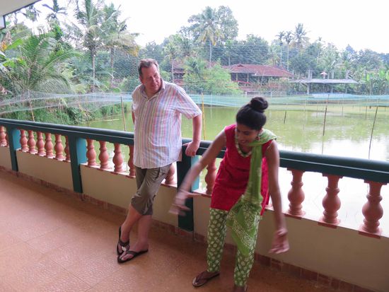 Wir hatten den halben Koffer voll mit Gastgeschenklen (Schwarzbrot!!), die auch mit großer Freude angenommen wurden. Wir kamen an bei "BASIS Farm Tours and Ayurveda Pvt. Ltd.", einer wunderschönen, großen Anlage mit Häusern in klassisch-keralischem Stil, eingebettet in einen tropischen Garten. Der Tag verging mit interessanten Gesprächen über die Unterschiede zwischen Deutschland und Indien, der komplizierten Struktur dieses Subkontinents, der nicht nur aus unterschiedlichen Ländern besteht, sondern auch noch durch verschiedene Religionen und Kasten geteilt ist. In dem die Zukunft mit einer dynamischen IT-Branche neben fast steinzeitlichen Lebensverhältnissen existiert.