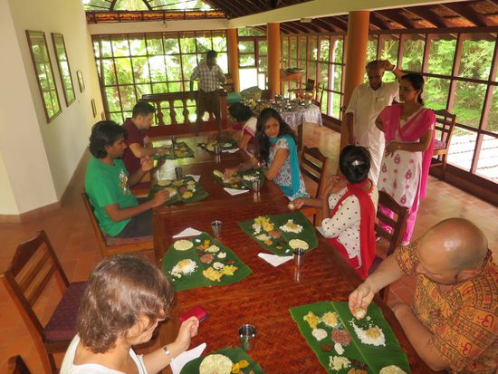 Als uns dann statt des bestellten Tees gleich das Abendessen auf den Tisch geknallt wurde, waren wir darüber nicht glücklich. Wir wurden aber informiert, dass das hier kein Hotel, sondern ein "Projekt" sei und da gäbe es Tischzeiten, an die sich zu halten sei. Damit war der Abend gelaufen. Als wir am nächsten Morgen unsere vorzeitige Abreise ankündigten, wurden wir zumindest noch zum festlichen Mittagessen eingeladen. Das war kulinarisch nicht aufregend, aber wunderschön serviert, als einzelne kleine Portionen auf dem Bananenblatt. Diese waren zu essen wie sich das in Indien gehört, mit den Fingern der rechten Hand. Das ist nicht einfach. Bis man versteht, dass diese Essmanieren sich wenig vom Spiel im Sandkasten unterscheiden.
