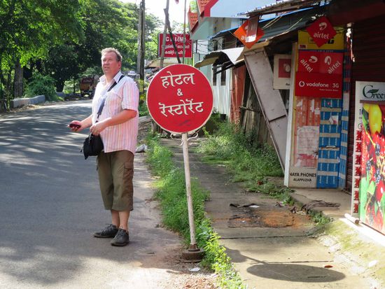 Endlich finden wir ein Restaurant und hier bekommen wir das beste Essen unseres Aufenthalts. Es gibt wohl inzwischen mehrere davon in Alleppey, wir haben die Mutter der Thaff-Restaurants erwischt. Es ist eng, laut und sehr freundlich hier. Wir bekommen schnell zwei Plätze zugewiesen, die Speisekarte und - da Westler - auch Besteck auf den Tisch.
