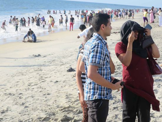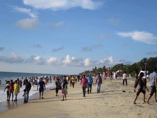 Wir halten ein Rikscha an und lassen uns an den Strand bringen. Und wieder einmal ist die Überraschung groß. Es ist der Nationalfeiertag und die halbe Stadt hat sich aufgemacht ans Meer. Nein, nicht zum Baden, sondern zum Flanieren. Familien mit Kindern, Freundesgruppen und Menschen, die zusammen im Büro sitzen, treffen sich am Meer um zu bummeln und zu entspannen.