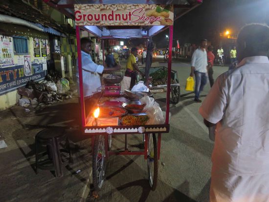 Jetzt sieht die Satdt plötzlich ganz anders aus. Die Geschäfte haben offen und sind hell beleuchtet, die Strassen sind lebendig und die Bürgersteige sind voller kleiner Geschäfte. Es gibt Obst und Gemüse, Früchte und Snacks und jede Menge Blumen und Blütenketten, um sie im Tempel zu opfern. So ändern sich alle paar Meter die Farben und Gerüche.