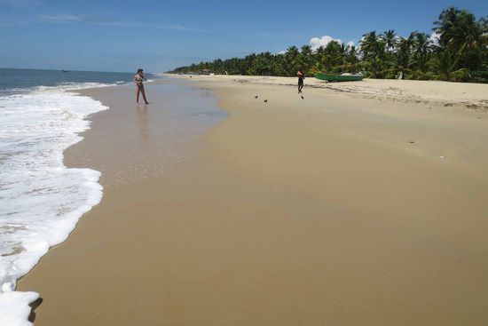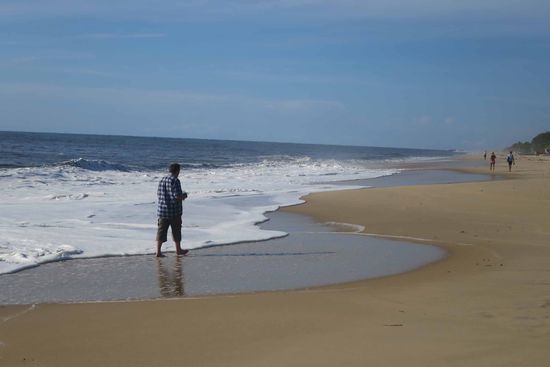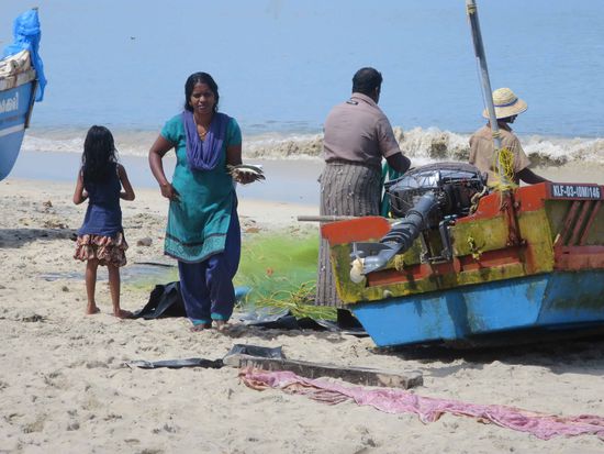 Kilometerlanger goldener Strand, touristisch wenig erschlossen und gesäumt von Palmwäldern. Dahinter wohnen vor allem Fischer, denn der indische Ozean ist in Küstennähe sehr fischreich. Die Backwaters spülen enorme Mengen organisches Material und Sediment ins Meer und das freut den Fisch. Den Touristen weniger, denn das macht das Wasser trübe und dunkel. Im Wasser kommt kein "karibikfeeling" auf, auch wenn alles andere dazu paßt.