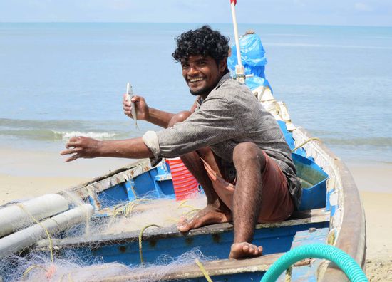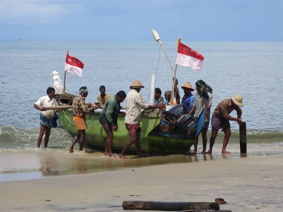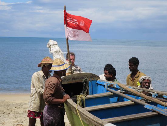 Am nächsten Morgen, die Sonne hat noch nicht die volle Kraft, spazieren wir den Strand entlang und sehen den Fischern zu, die Ihren Fang anlanden und die Boote an Land ziehen. Eine helfende Hand wird gerne gesehen und mit einem freundlichen Lächeln belohnt. Englisch spricht keiner der Fischer.