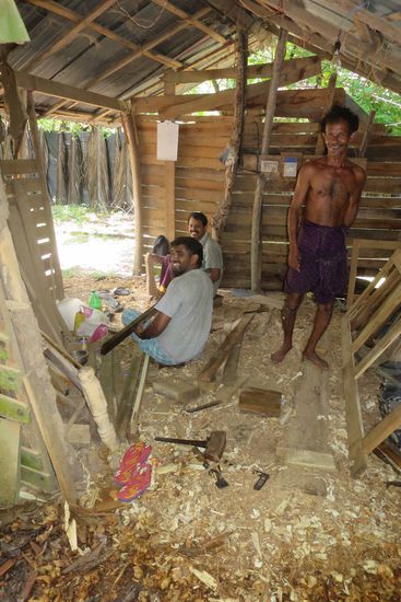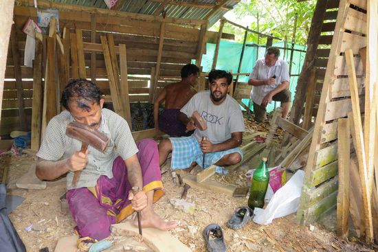 Wir bemühen uns, niemanden mit der Kamera zu überfallen und erstmal mit einem Lächeln und einem freundlichen "hello" auf die Menschen zu zu gehen. Die Reaktion ist meistens eine überwältigende Freundlichkeit. Die Arbeit und die Boote werden uns erklärt und auch wenn wir das meiste nicht kapieren, so entsteht doch ein freundlichen Kontakt. Oft werden wir auch ins Haus eingeladen oder zumindest, mit ins Dorf zu kommen. Die Häuser stehen locker verteilt unter den Palmen, abgegrenzt von kleinen Mäuerchen oder einer Hecke. Strassen gibt es nicht, nur breite Sandwege zwischen den Häusern.