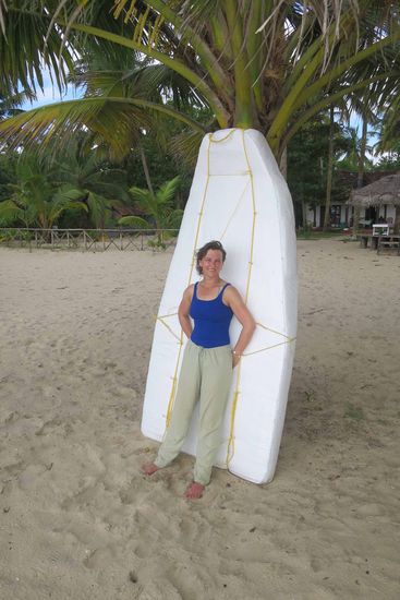 Immer wieder sehen wir weiße Teile an die Palmen gelehnt. Das sind in Plastik eingenähte Styroporblöcke, die zu einem Floß geformt wurden. Damit paddelt ein einzelner Fischer frühmorgens weit hinaus auf das Meer, um dort seine Netze auszuwerfen. Er kommt dann erst zu Sonnenuntergang wieder zurück. Damit das Styropor wieder trocknet, werden sie an die Palmen angelehnt. Vertrauenserweckend sehen diese Geräte nicht aus und ich möchte nicht darauf sitzen, wenn Wind aufkommt.