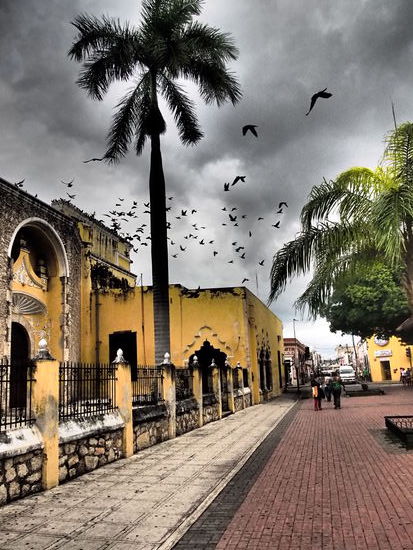 Danach laufen wir eine lange Zeit planlos, aber nicht ohne Schönes zu entdecken, durch die Gegend. Jede Ecke bietet Neues und lädt zum Fotografieren und Verweilen ein. Weil uns der Platz am Vortag so gut gefallen hat, machen wir zwischendurch einen Abstecher zur "Plaza de la Independencia", wo es ein großes Aufgebot an Polizisten gibt - sowohl am Boden aber auch per Hubschrauber - die minutenlang den Platz umkreisen. Allesamt verhüllt und schwer bewaffnet. Man hätte meinen können, dass ein neuer US-Streifen gedreht wird. Kurz darauf kommen wir mit José, einem Einheimischen, ins Gespräch, der uns erzählt, dass ganz Mérida derzeit aufgrund der Flüchtlingskrise patroulliert werde. Außerdem erzählte er viel Interessantes über seine Heimat - in bestem englisch (leider nicht selbstverständlich, da hier nur wenige diese Fremdsprache beherrschen). Wir haben u.a. erfahren, dass der Panamahut eigtl. Jipijapa heißt (wird Hipihapa ausgesprochen), was soviel wie "flexibel" in der Sprache der Maya bedeutet und dass Mexikaner in Hamacas (Hängematten) schlafen. Im Anschluss an das tolle und informative Gespräch sind wir in den Shop "Guayaberas TITA" gegangen (wie von José vorgeschlagen), da man hier angeblich die qualitativ besten Andenken (Hamacas, Hemden, Schnitzereien, Teppiche u.v.m.) bekommen könne. Wir sind zwar nicht fündig geworden, können aber bestätigen, dass der Laden auf 2 riesengroßen Etagen unglaublich viel zu bieten hat und sicher viele Touristenherzen glücklich machen kann.