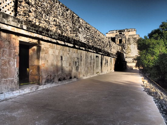 Wir verlassen die Anlage und wollen nach Campeche weiter. Hier in Uxmal fahren die Busse deutlich seltener und wir hoffen, dass die Angabe der Dame am Ticketschalter (in Mérida) stimmt und der letzte Bus um 18:30 Uhr kommt. Weil ich schwächele und wir mit der Besichtigung der Ruinen schon deutlich früher als erwartet, fertig sind (normalerweise wären wir wohl auf jede Pyramide gestiegen, um die Aussicht zu genießen - aber leider nicht heute), stehen wir bereits um kurz nach 17 Uhr an der "Haltestelle" (es gibt eigtl. keine - du wartest einfach da, wo dich der Bus zuvor rausgelassen hat). Die beiden New Yorker, Dan und Kevin, warten ebenfalls dort, weil es auch für sie nach Campeche gehen soll. Die Zeit vergeht trotz eines netten Smalltalks, das die Amis beherrschen wie kein anderes Volk, leider nicht so schnell. Aber dann kommt er endlich und...ist pünktlich!