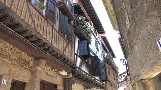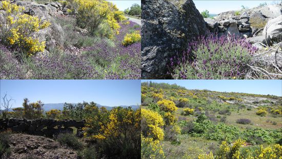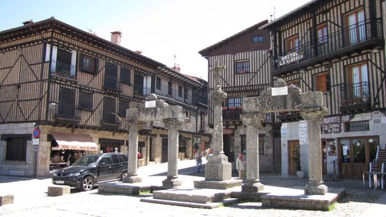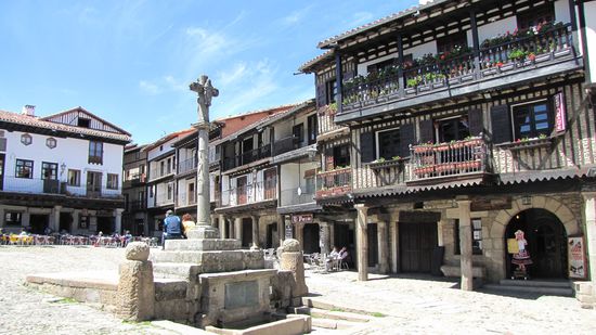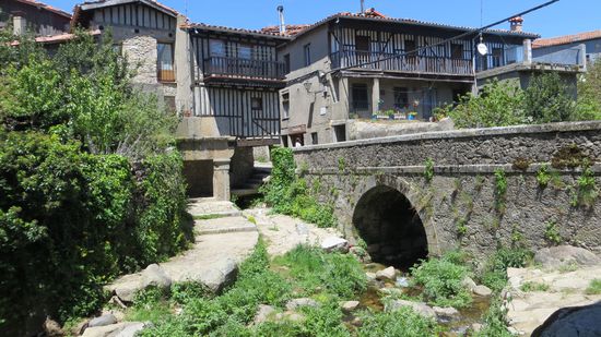 In Béjar kurzer Besuch im Supermarkt fürs Mittagessen und dann geht es in die Berge, vorbei an extrem blühenden Hängen. Ginster, Schopflavendel und teilweise auch Mohn überbieten sich gegenseitig. Bis nach La Alberca (180 km) mit seiner ganz besonderen Architektur. Eng stehen die alten, inzwischen wieder gepflegten, Fachwerkhäuser beieinander. Der schöne Ort lädt uns zu einer Mittagpause bei einem alten Obstgarten ein. Es gibt Brot, leckeren Schinken und einen herzhaften Käse. 22°C
