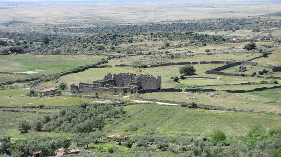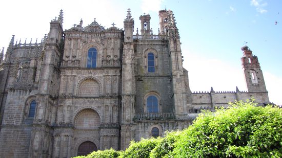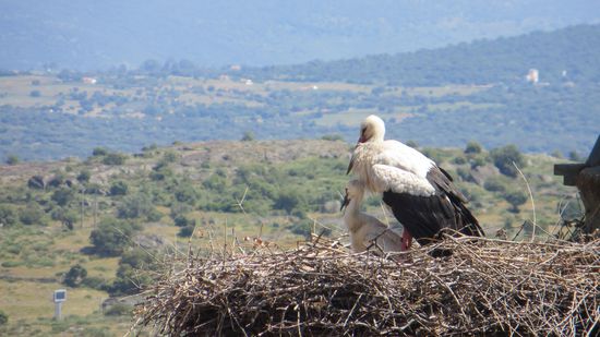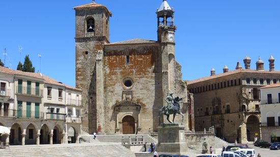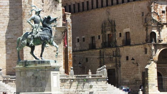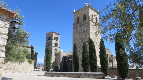 Was gibt es besseres, als mit Blick auf die Plaza Mayor mit dem Denkmal von Francisco Pizarro bei einem leckeren Eis zu sitzen und die Störche auf den umliegenden Dächern klappern zu hören. Bei 30° Spaziergang durch den tollen, sehr schönen Ort mit vielen Palacios bis hoch zum Alcazaba. Noch ein kurzer Besuch der Iglesia de San Martin und dann Weiterfahrt in die Ebene von Cáceres. Hier gibt es keine Korkeichen mehr. Die Landschaft ist eher eintönig.