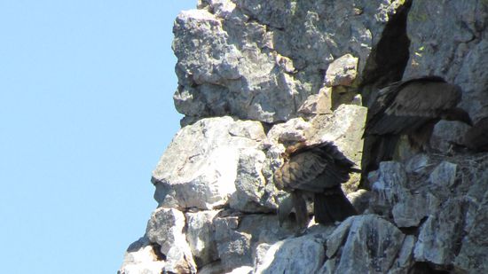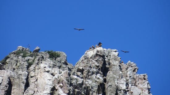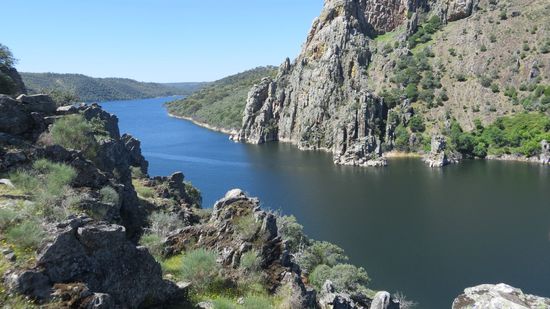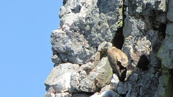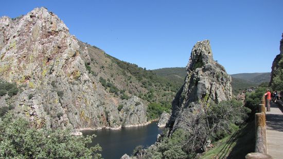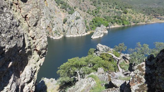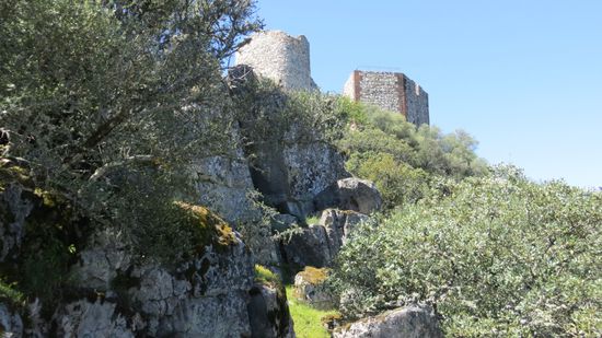 Und hier dann – Aufenthalt bei den „Geierfelsen“. Beeindruckend. Die Geier und viele andere Greifvögel nutzten die Thermik bei blauem Himmel und angenehmen Temperaturen. Der Felsen ragt imposant in die Höhe und viele Fotografen haben sich an der Aussichtsplattform mit Stativen aufgebaut. Dann noch hoch auf das Castillo de Montfragüe mit super Aussicht.