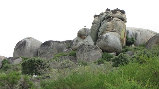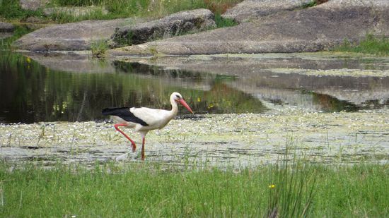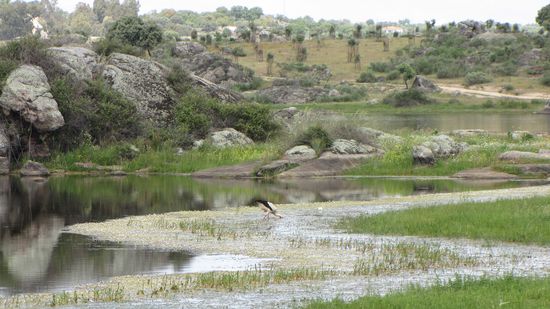 Nachmittags machen wir einen Ausflug ins Grüne zum Parque Los Barruecos westl. von Cáceres. Dort ist ein kleiner Stausee inmitten einer „Parklandschaft“ mit imposanten Granitkegeln, auf denen gern Störche brüten. Nach der Hektik in der Stadt genießen wir hier unser Picknick und die Landschaft. 25°