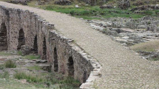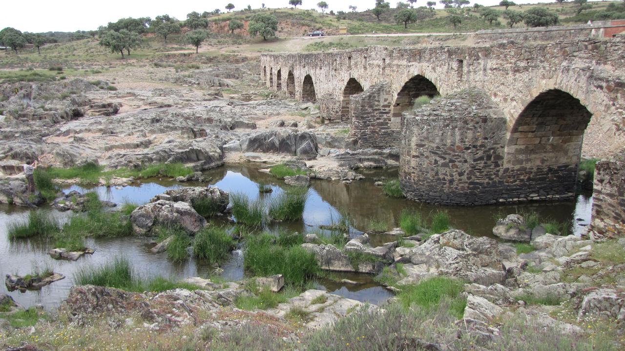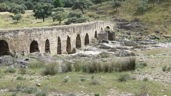 Am späteren Nachmittag geht es dann weiter ins hügelige Land Richtung Portugal. Nach etwa 15 km zweigt eine kleine unscheinbare Straße nach links ab. 2 km weiter überrascht eine lange alte Brücke (römischen Ursprungs???). Sie führt mit mind. 10 Bögen über den wasserführenden Salor. Nur wenige Meter weiter steht eine weitere, neuere aber auch stillgelegte, Brücke aus roten und gelben Klinkern.