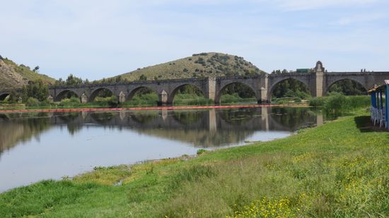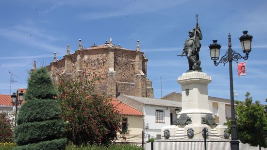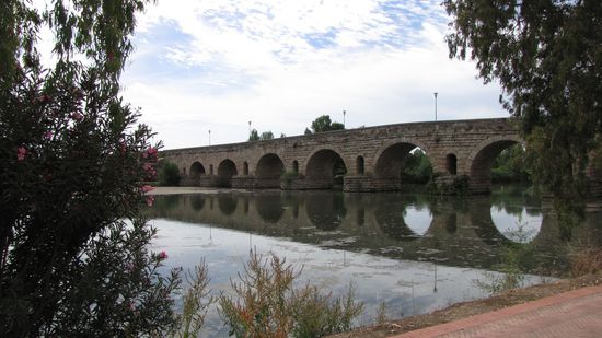 In Medellin überrascht uns die Größe des gepflegten Rathausplatzes mit dem Standbild von Hernan Cortez. Nach einer Kaffeepause noch ein kurzer Spaziergang bis an die Festungsanlage. Bevor wir weiterfahren: Picknick mit Blick auf die lange Brücke aus dem 16. Jh. über den Guadiana.