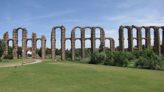Merida wurde von den Römern (Augustus) für die Veteranen der siegreichen Legionen gegründet (EMerida für emeritierte Soldaten). Auf der Suche nach unserem Hotel erhaschen wir noch einen Blick auf die Überreste des Acueducto de Los Milagros.