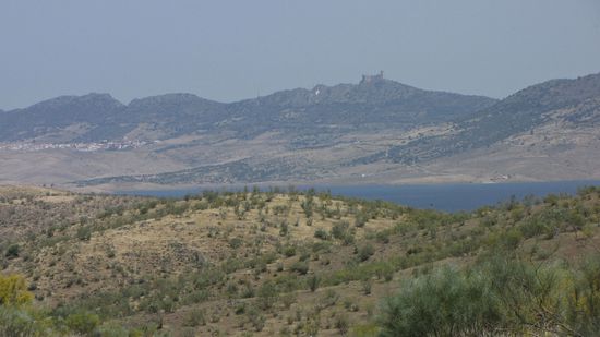 Auf nach Norden in die Berge über Alcaracejos und Cabeza del Buey. Dort auf die EX302 Richtung Puebla de Alcover. Inmitten einer trockenen Bergregion, in der keine Landwirtschaft mehr möglich scheint, liegt hier der riesige Stausee „ Embalsa de la Serena“.