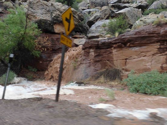 Wir entschlossen uns zum Verzicht auf den Park, der wahrscheinlich sowieso gesperrt war und traten an zum "taktischen Rückzug". Unterwegs musste Uli unseren Wagen immer wieder durch tiefe, riesige Pfützen lenken, während es von den Hängen direkt neben uns nur so herunterströmte.