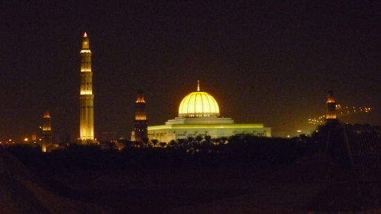 Die Kuppel der Sultan Qabus Moschee leuchtet jetzt wie glühendes Gold unter dem dunklen Nachthimmel und die Minarette sind geheimnisvoll angestrahlt.