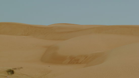 Wir drehen noch ein paar Runden in den Dünen. Ganz vorsichtig fährt Saif auf den Abgrund zu. Steil neigt sich die Düne nach unten. Wie Kratzer auf einem alten Holzbrett ziehen sich die Spuren andere Fahrzeuge im Sand da unten, und schon brettert unser Wagen mit viel Staub den Abhang hinunter.
