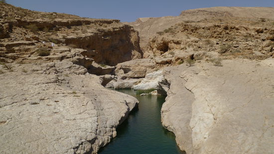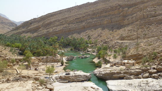 Ein kleines Stück talaufwärts offenbart sich die ganze Schönheit des Wadis. Smaragdgrüne Pools liegen zwischen den hellen Felsen und den Palmen, laden zum Baden ein. Auf einer Anhöhe ist ein kleines Restaurant, wo wir zu Mittag essen. Es gibt wieder Indisch: Reis Biryani. Saif erzählt, dass sich die Indische und die Omanische Küche bis auf die Gewürze fast gleich sind.